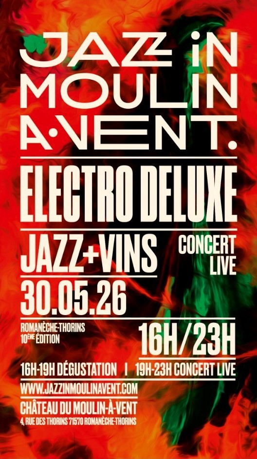 Chaque dernier samedi du mois de mai, l’événement Jazz in Moulin-à-Vent conjugue musique et dégustations de vins du Beaujolais. Rendez-vous à partir de 16h au Château du Moulin-à-Vent pour des dégustations suivies de concerts de jazz. De 16 à 19H, 14 domaines phares de l’appellation vous attendent pour vous présenter leurs cuvées dans la cour du château (sur fond de jazz bien sûr!). Ensuite, place au concert d’Electro Deluxe à partir de 20H30 dans le magnifique parc ! Restauration sur place (sur réservation)