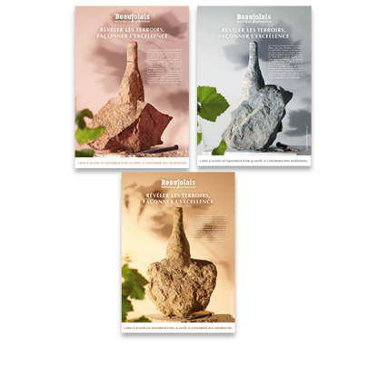3 modèles d’affiches : pierre bleue, granite rose et pierre dorée.